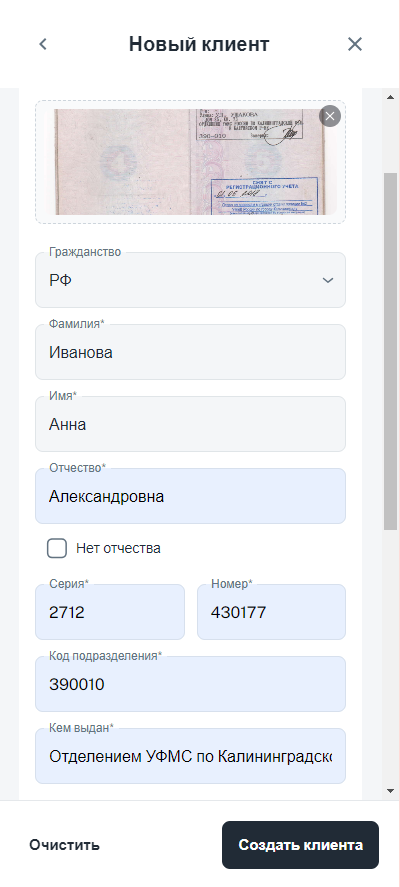 Создайте клиента, чтобы перейти к следующему этапу. Система покажет созданного клиента и уведомит о факте загрузке фото паспорта. При необходимости вы можете выбрать другого клиента из базы контрагентов, а также отредактировать текущего (иконка «Карандаш») или отменить выплату. Данные, указанные на этом этапе, сохраняются в базе и не требуют повторного ввода.