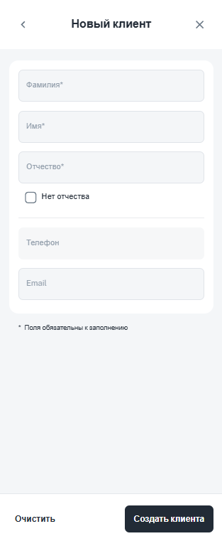 - Отчество контрагента (отметьте чекбокс «Нет отчества», если его нет по паспорту);