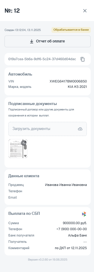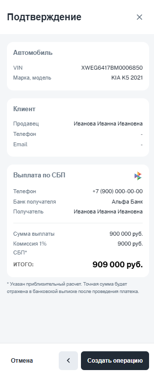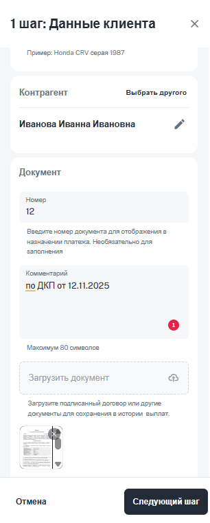 При необходимости вы можете выбрать другого клиента из базы контрагентов, отредактировать текущего (иконка «Карандаш») или отменить выплату. Данные, указанные на этом этапе, сохраняются в базе и не требуют повторного ввода.