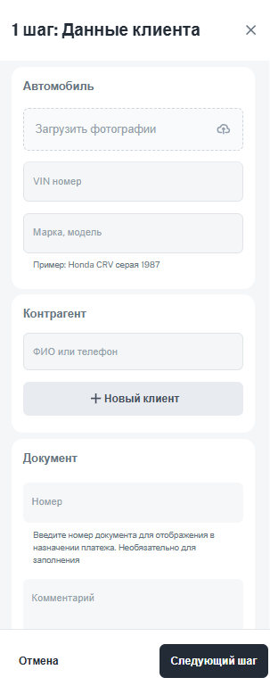 Данные клиента (контрагента) — это информация о продавце или физическом лице, которому производится выплата за автомобиль.