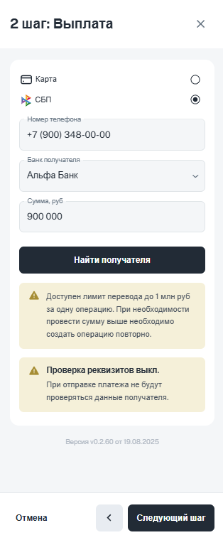 Подробнее о поиске и проверке получателя в СБП в статье «Проверка реквизитов получателя при выплате по СБП».