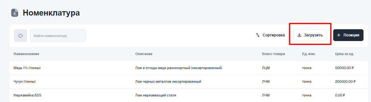 В этом разделе отображаются все позиции вашего каталога, их наименование, описание, класс лома, единица измерения и цена за единицу.