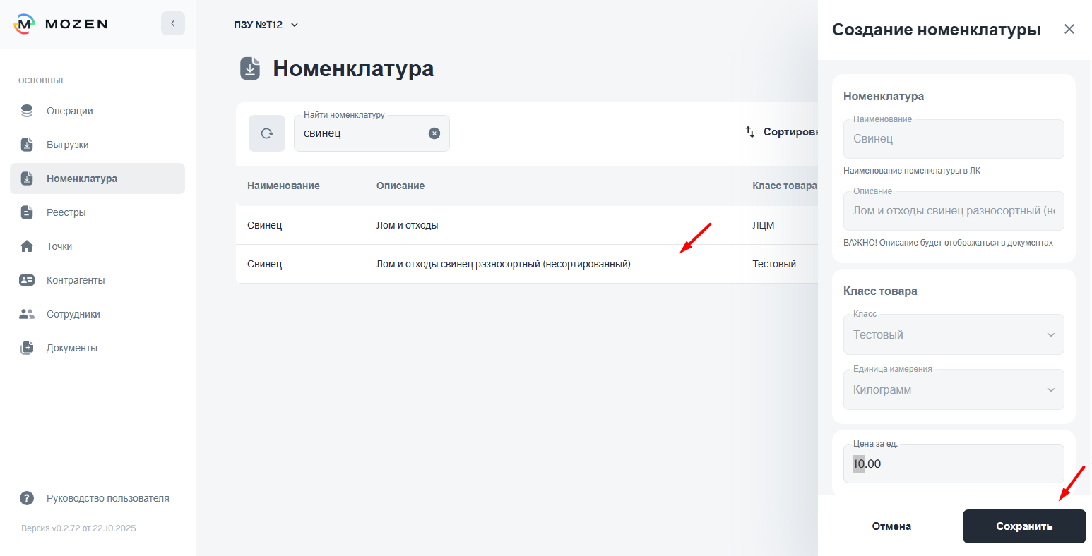 - Указать наименование номенклатуры в ЛК. Например, Свинец.