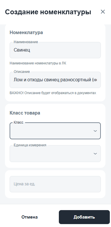 - Указать описание, которое будет отображаться в документах. Например, Лом и отходы свинец разносортный (несортированный).