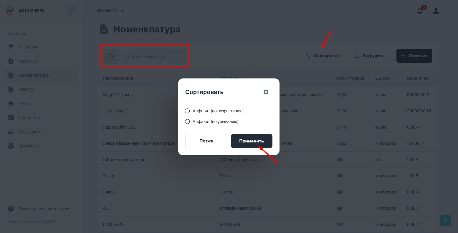 В разделе также доступны обновление списка позиций, поиск по названию и сортировка по алфавиту.