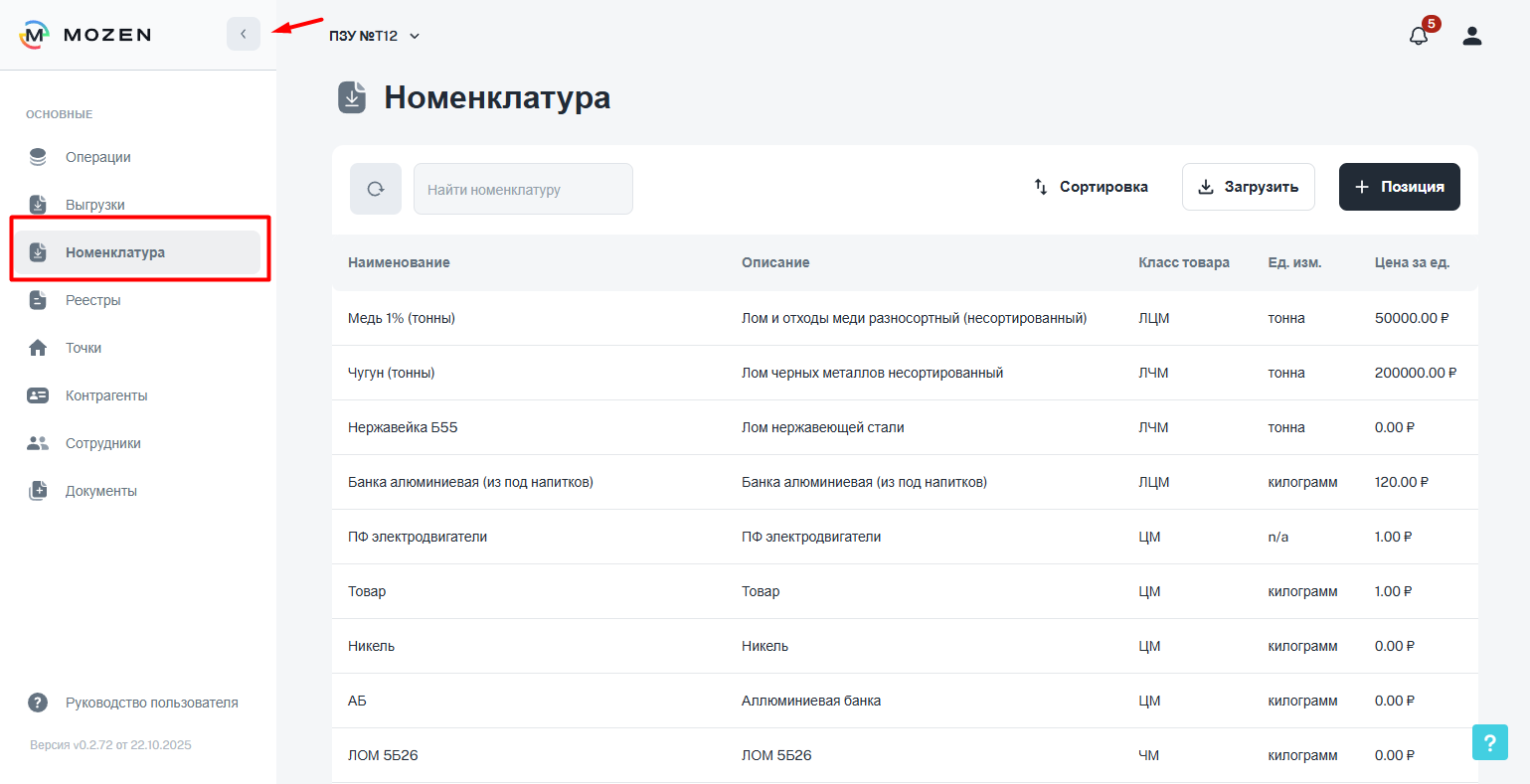 Функционал работы с номенклатурой доступен в левом боковом меню личного кабинета. В разделе «Номенклатура» можно добавлять новые позиции, а также просматривать и редактировать данные уже существующих.