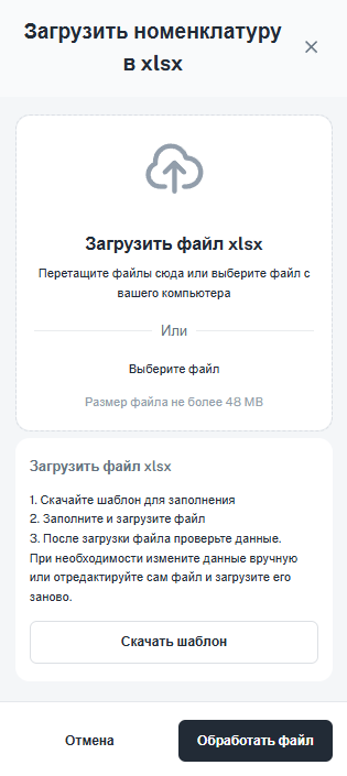 Загрузить список номенклатуры вы можете в формате xlsx по кнопке «Загрузить».