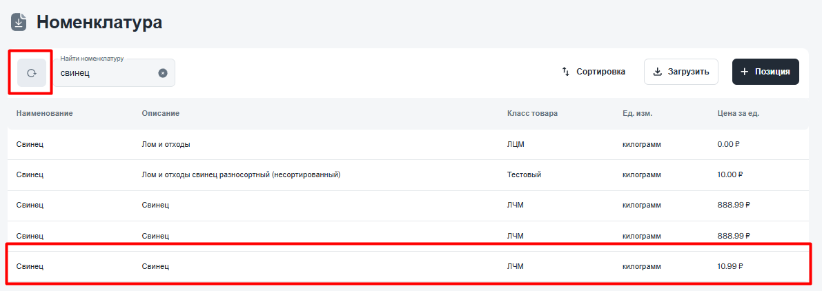 - Обновите список номенклатуры по круговой стрелке в шапке таблицы.