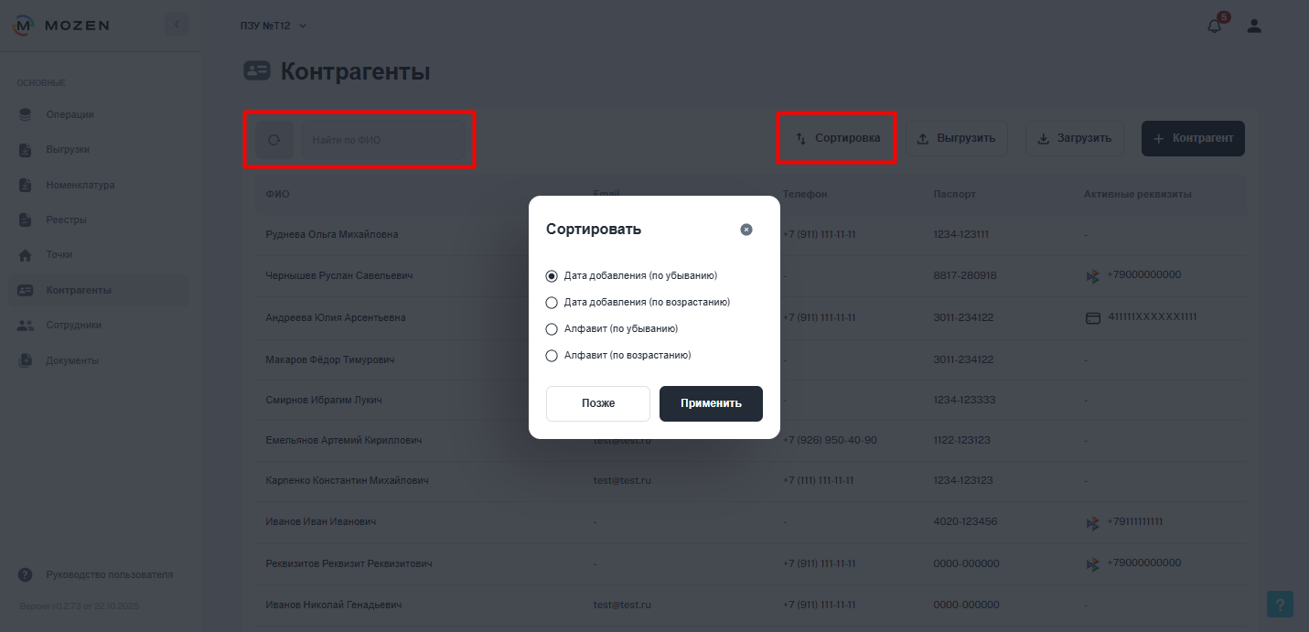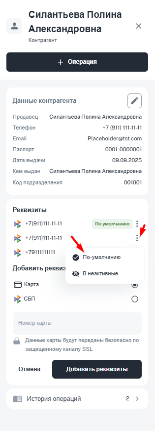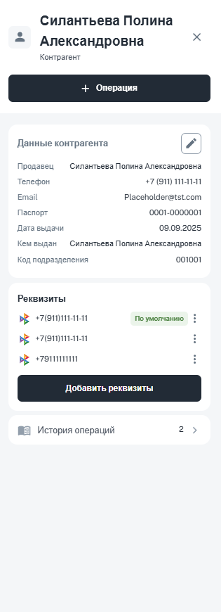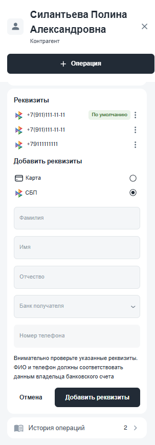 Найдите контрагента в списке по ФИО и откройте его карточку. В ней будут отображены персональные данные контрагента, реквизиты, на которые ранее осуществлялись выплаты, а также история операций.