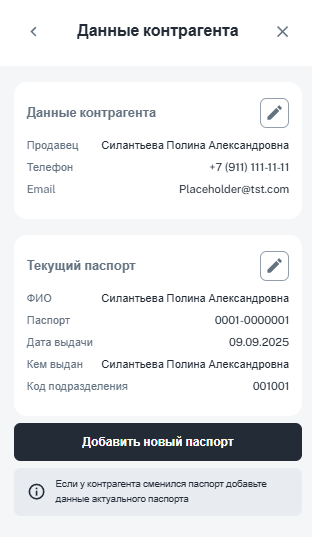 • Отредактировать данные контрагента по иконке «Карандаш» в блоке «Данные контрагента». Система позволит изменить персональные данные, обновить текущий паспорт или добавить новый.