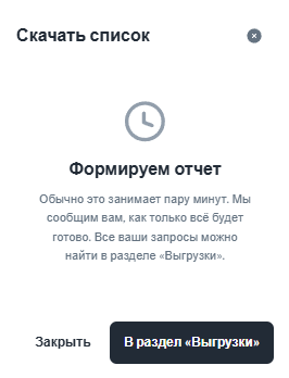 • По кнопке «Выгрузить» система предложит скачать полный список контрагентов.  Как только выгрузка будет готова, вы сможете скачать отчет в разделе «Выгрузки».