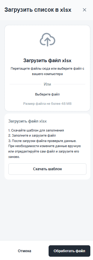 • По кнопке «Загрузить» откроется боковое окно для загрузки файла в формате xslx.