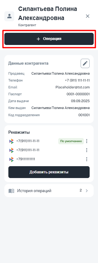 • Создать новую операцию из карточки контрагента по кнопке «+ Операция».
