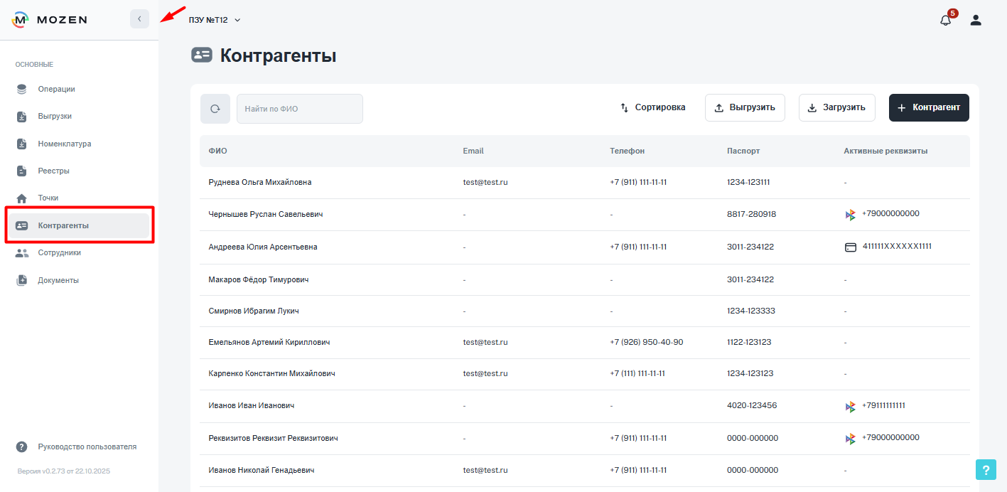 Функционал работы с контрагентами находится в левом боковом меню личного кабинета.