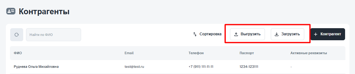 В шапке таблицы с контрагентами доступен функционал выгрузки и загрузки списка клиентов в базу.
