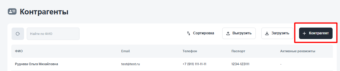 При проведении выплаты новому контрагенту он автоматически добавляется в вашу базу контрагентов. Даже если на этапе выплаты вы указали контрагента без паспортных данных, позже в разделе «Контрагенты» вы можете отредактировать карточку и добавить паспорт.